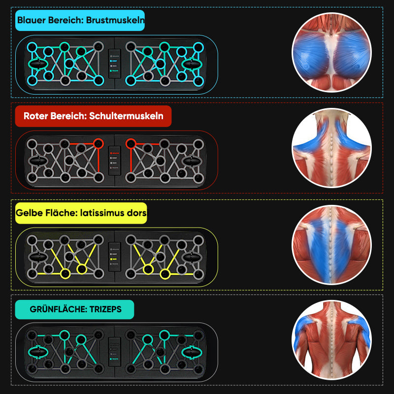 • Farbcodierte Zielbereiche: Entworfen mit farbcodierten Zonen für bestimmte Muskelgruppen – blau für die Brust, rot für die Schultern, gelb für den Rücken und grau für den Trizeps. Dieses System gewährleistet ein umfassendes Ganzkörpertraining und leitet Übungen zur Maximierung der Muskelbelastung.