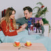 • Saisonale Getränke: eine rosa Tasse Kakao mit Schneeflockenmotiv und einem Schneemann-Marshmallow, eine blaue Tasse Kakao mit Schneeflockenmotiv, eine blaue Tasse Punsch, ein Glas Milch mit Schneeflockenmotiv und eine violette Teetasse mit Schneeflockenmotiv sowie eine violette Untertasse